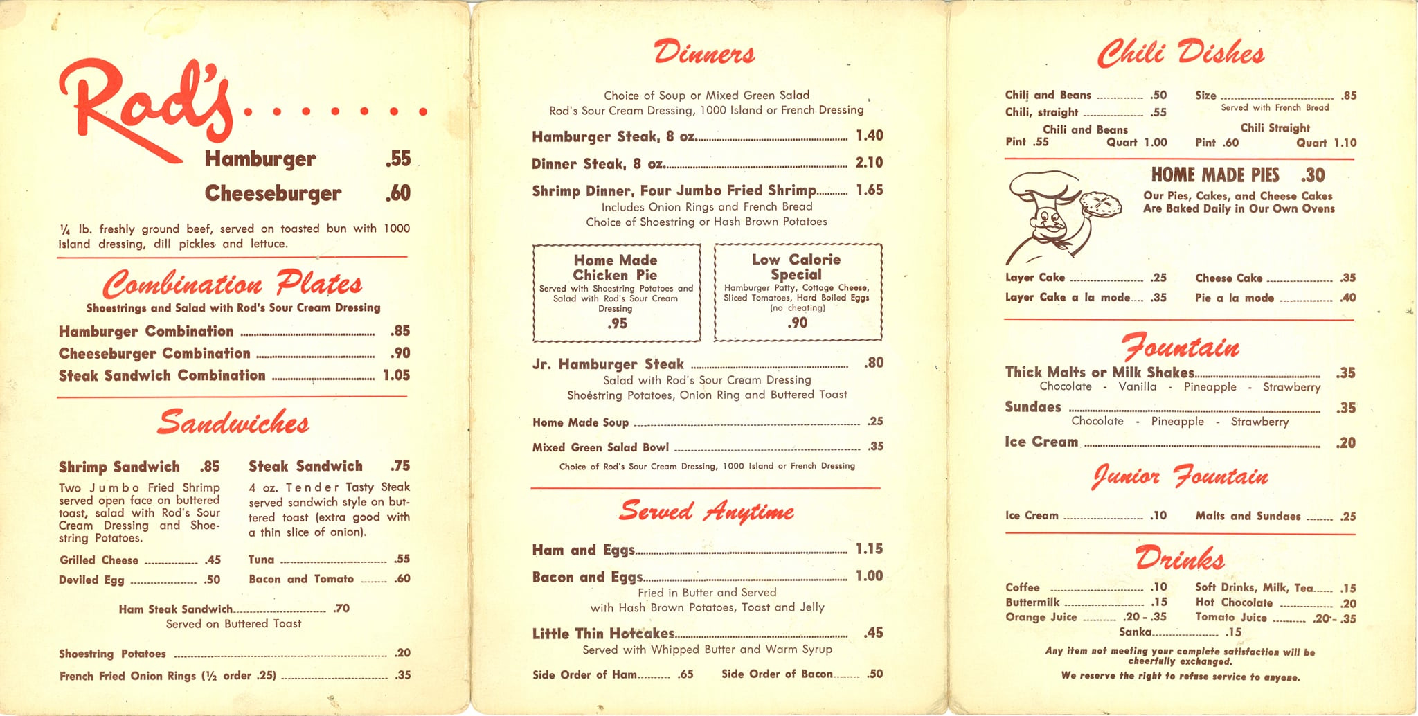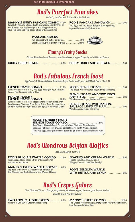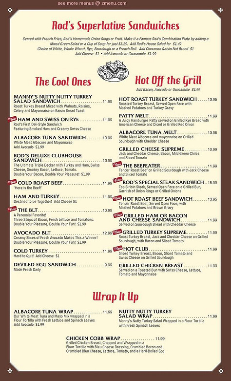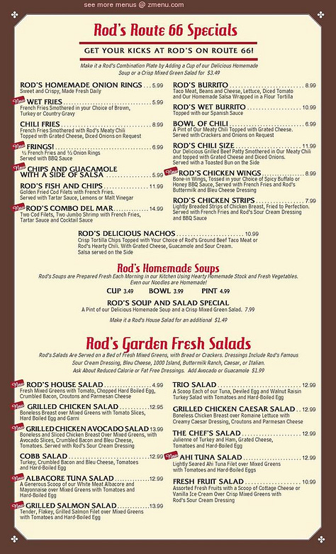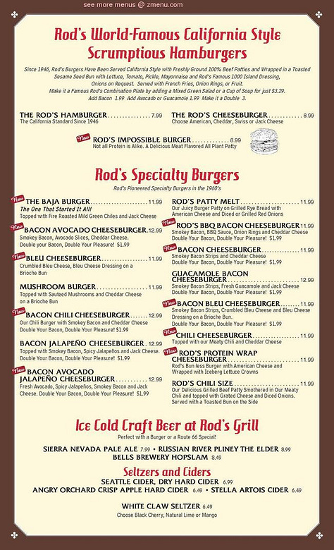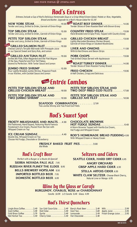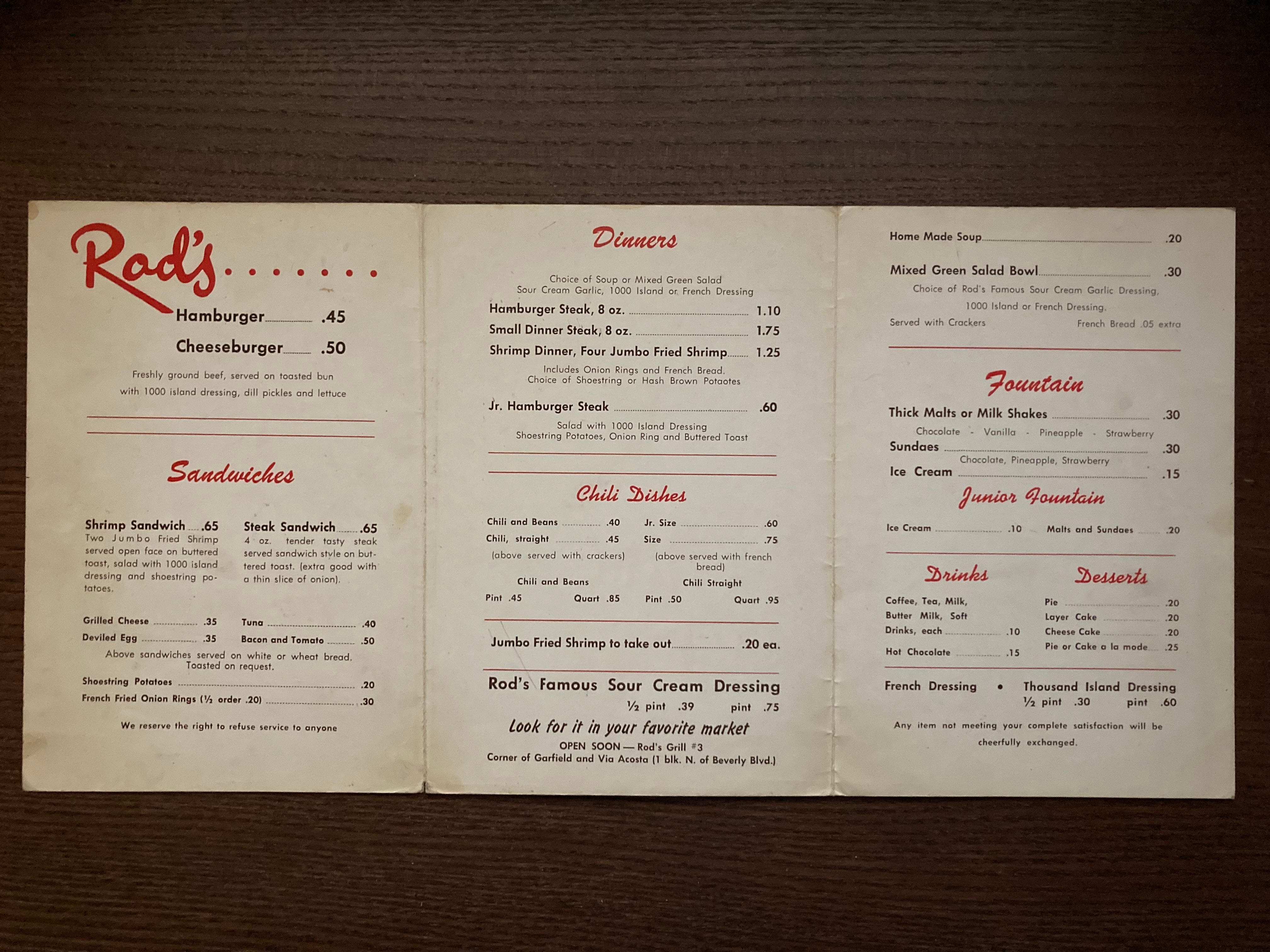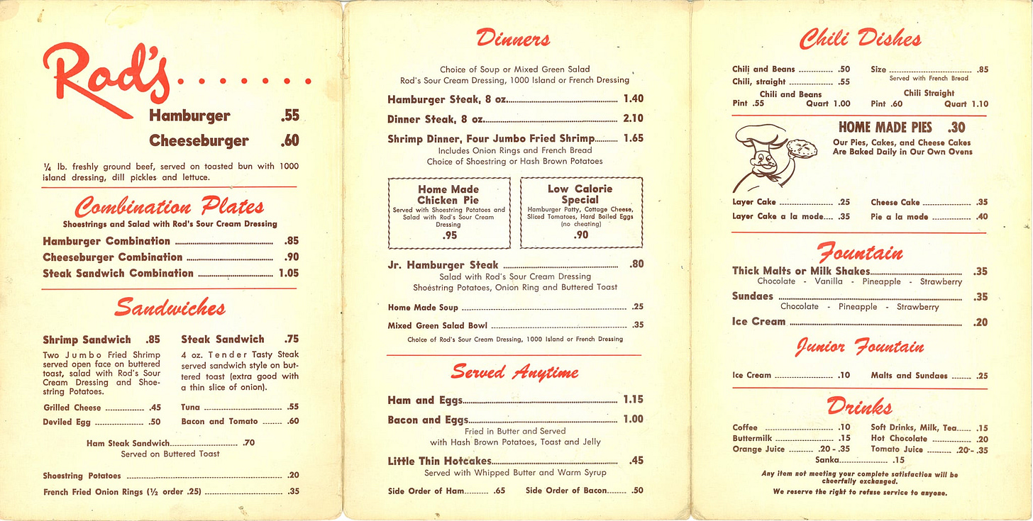 How does the new menu compare to old? What’s different, what’s the same? Here’s one from 1957, also found in the Fans of Rod’s Grill Facebook group. Notice how the onion rings are described as “french fried” but not the potatoes. The Low Calorie Special (“no cheating”) looks pretty low-carb/paleo to me.