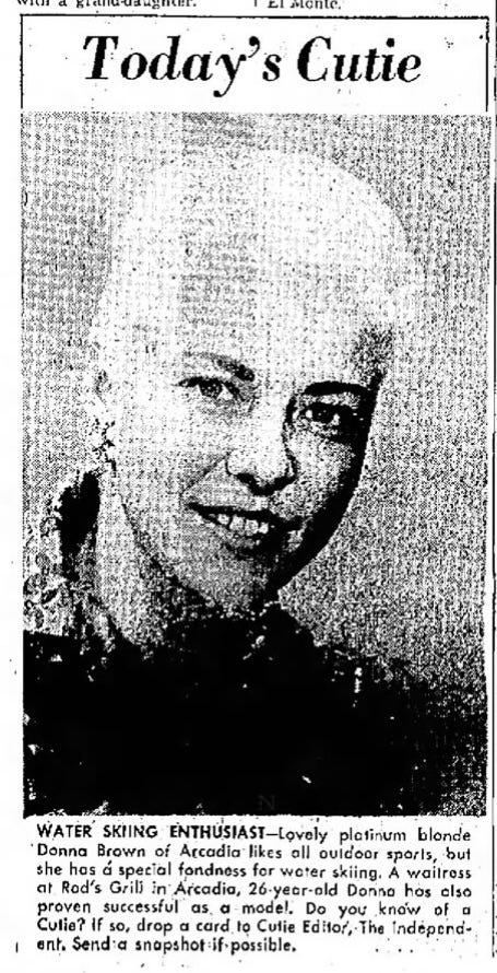 The one below is from Pasadena Independent, April 13, 1959. Hard to imagine a newspaper nowadays with a regular feature called “Today’s Cutie.” (Come to think of it, hard to imagine a newspaper nowadays.) Next time I see a matronly coffee shop waitress — the kind who snaps her gum and calls you “honey” — I’m going to assume in her youth she was a water skiing enthusiast.