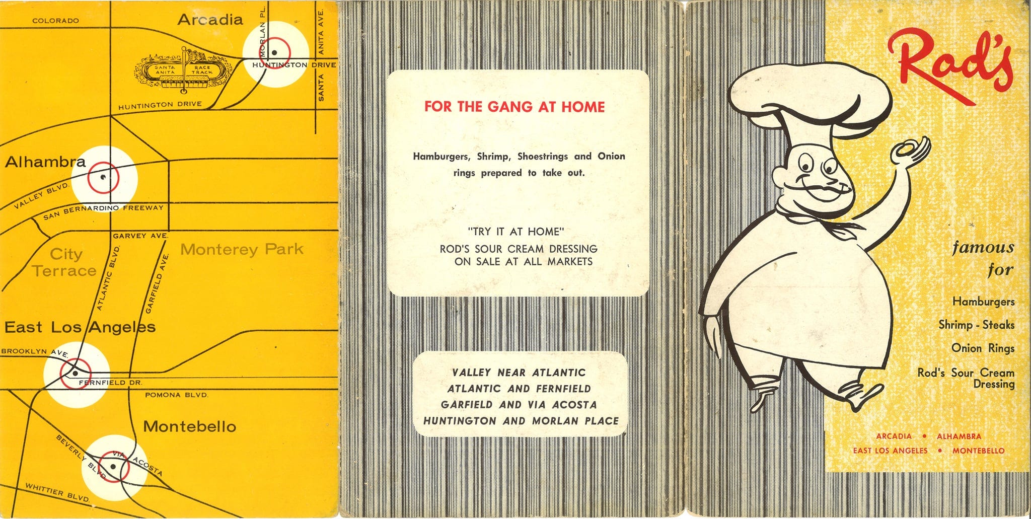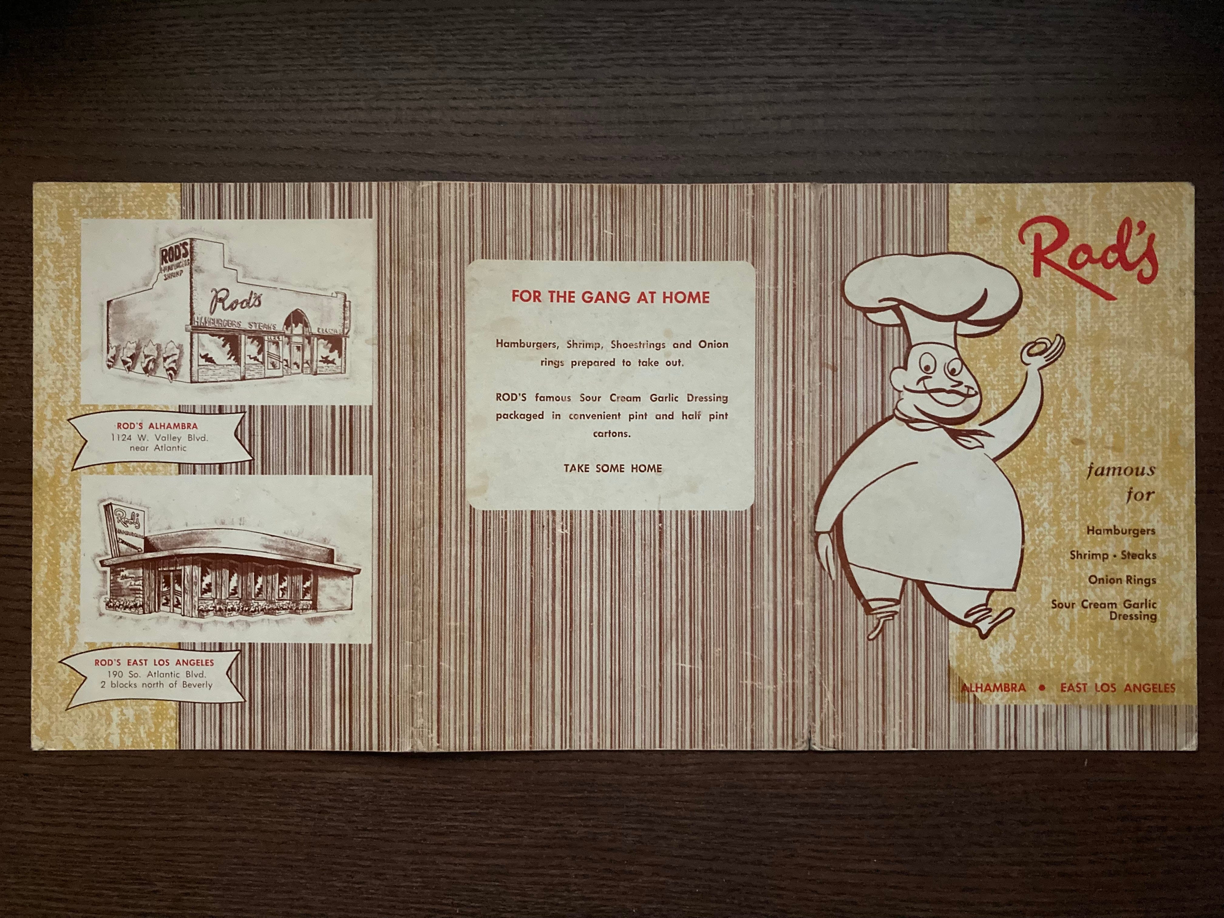 The dude who posted that menu described it as the “holy grail of Rod’s” but wait, I can do better. Here’s a menu from my collection, back when there were only two locations, shortly before the Montebello one opened. I like that his has the map but mine has the building illustrations. Otherwise, the menus are pretty similar. Haven’t been able to track down a recipe for the Sour Cream Garlic dressing which was sold in grocery stores. I wonder if there are any vintage jars out there. Gotta keep my eye out for ashtrays too.