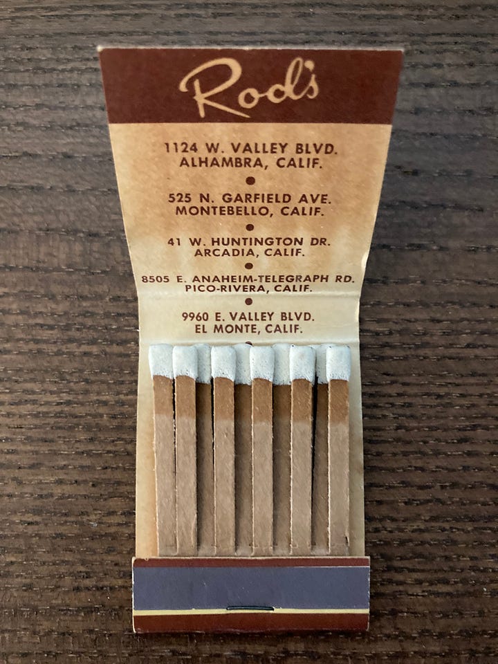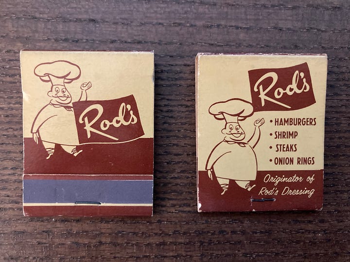 I also own some matchbooks. Doesn’t take an eagle eye to notice that a constant in the Rod’s brand was the chef of indeterminate ethnicity (French? Italian?) who clearly enjoyed eating. The portly chef mascot was pretty common during the midcentury period, lots of examples, but seems to mostly have disappeared. Deserves its own post.